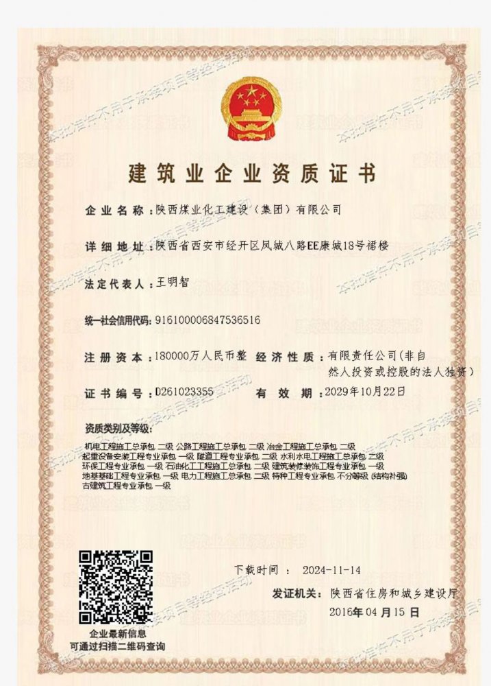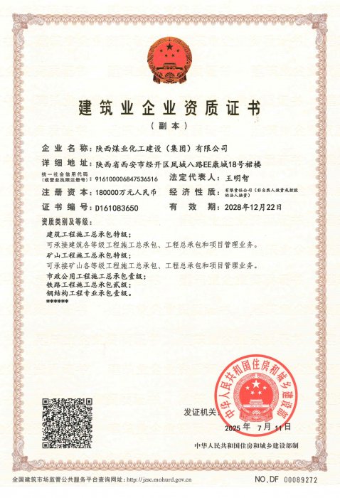 擁有建筑工程施工總承包、礦山工程施工總承包“雙特級”資質(zhì)和建筑行業(yè)甲級、煤炭行業(yè)(礦井、選煤廠)專業(yè)甲級設(shè)計資質(zhì);市政公用工程、鋼結(jié)構(gòu)工程、起重設(shè)備安裝工程、環(huán)保工程、建筑裝修裝飾工程、地基基礎(chǔ)工程、古建筑工程一級承包資質(zhì);機電工程、公路工程、冶金工程、鐵路工程、水利水電工程、石油化工工程、電力工程、隧道工程二級承包資質(zhì),同時具有特種工程專業(yè)承包資質(zhì)。